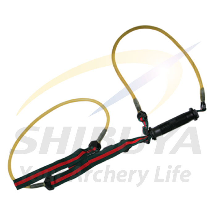 2.グリップから垂れ下がったゴムのベルトループにつま先を通して、土踏まずで踏みます。